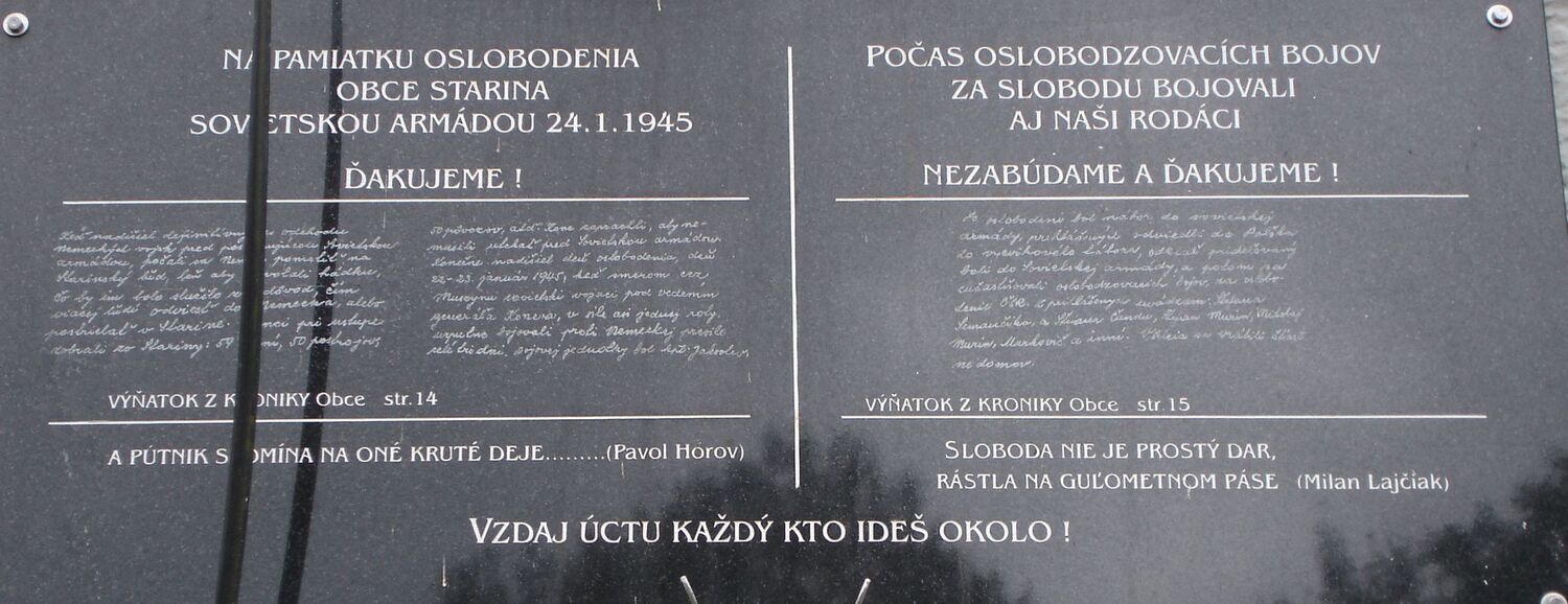 a ustanovili ju na budove Obecného úradu Starina na večnú pamiatku Sovietskej armáde našej osloboditeľke a Stariňanov, ktorí bojovali proti fašizmu za našu slobodu.